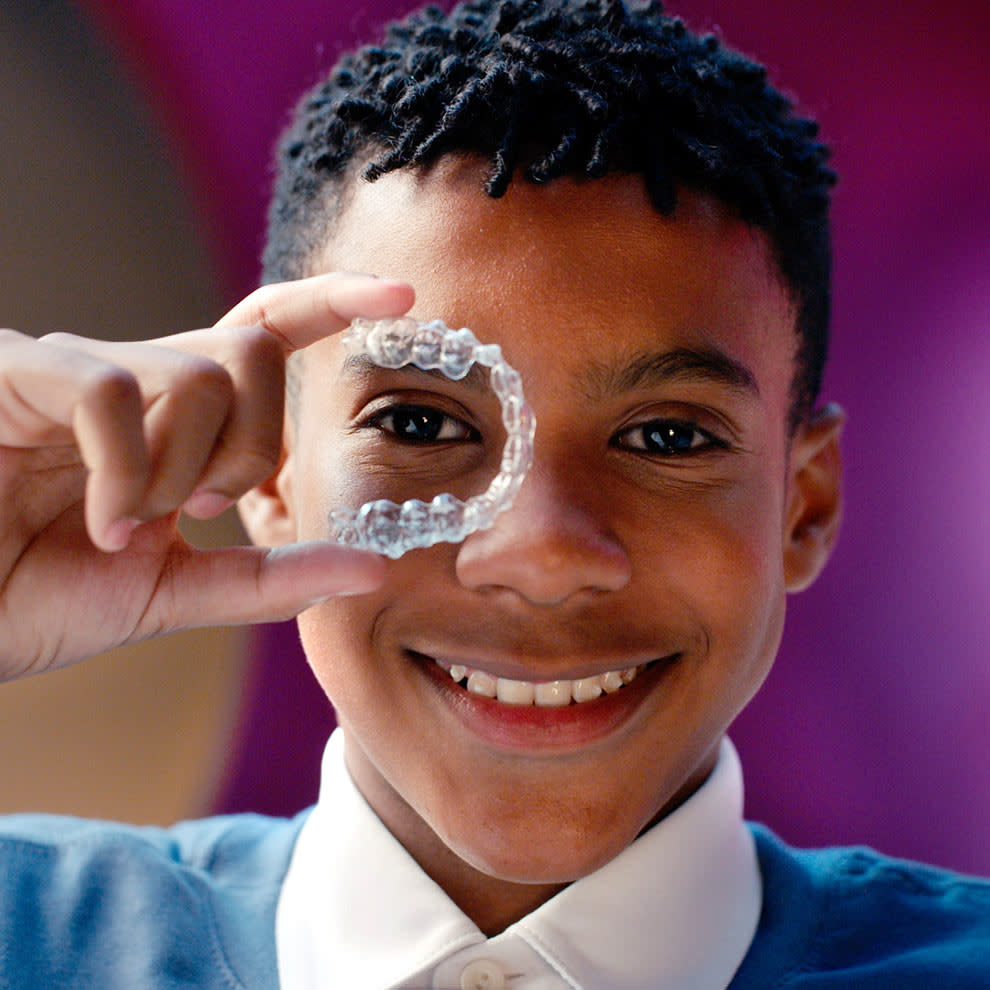 Customizados para crianças de 6 a 10 anos, os alinhadores Invisalign First são feitos para encaixar em dentes menores e tratar uma ampla variedade de casos ortodônticos que podem aparecer durante o crescimento.